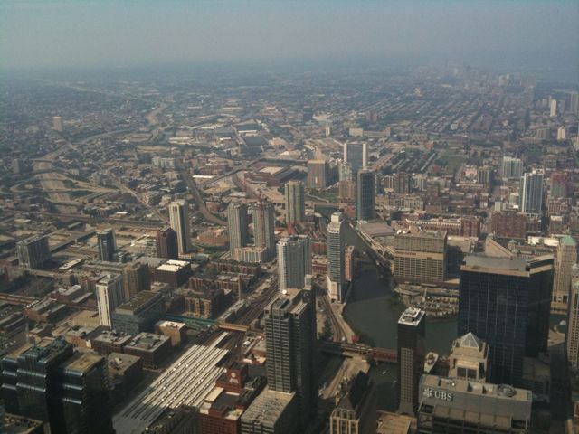 Yesterday in Chicago we took a water taxi to the Sears Tower (now the Willis Tower), the tallest building in the states, and queued for hours to go up it. I should tell you that I have two fears: heights and spiders. I suppose my absolute worst nightmare might be to be dangled from a great height above an enormous spider, but anyway, the Willis Tower Skydeck seemed specifically designed to torture people like me. They’ve built glass floors into overhanging ledges from the 103rd floor of the tower. And being the glutton for punishment that I am, I just had to go over it. Sarah did well and stood near the end quite early on (though she did admit that it was quite scary) – I had to kneel down and back onto it, only snatching glimpses of the sheer 1,000 foot drop below us. There’s a good photo (that I can’t post yet) of us above the ledge, pure fear visible in my eyes.